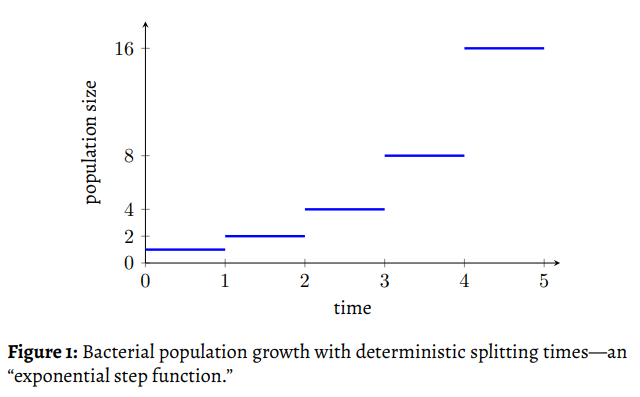 Think about it. Do you mean to say that the division time is always and precisely 1 hour? That’s no good. Then, the bacterial population becomes a step function, remaining constant for a whole hour, and then doubling in the final instant.