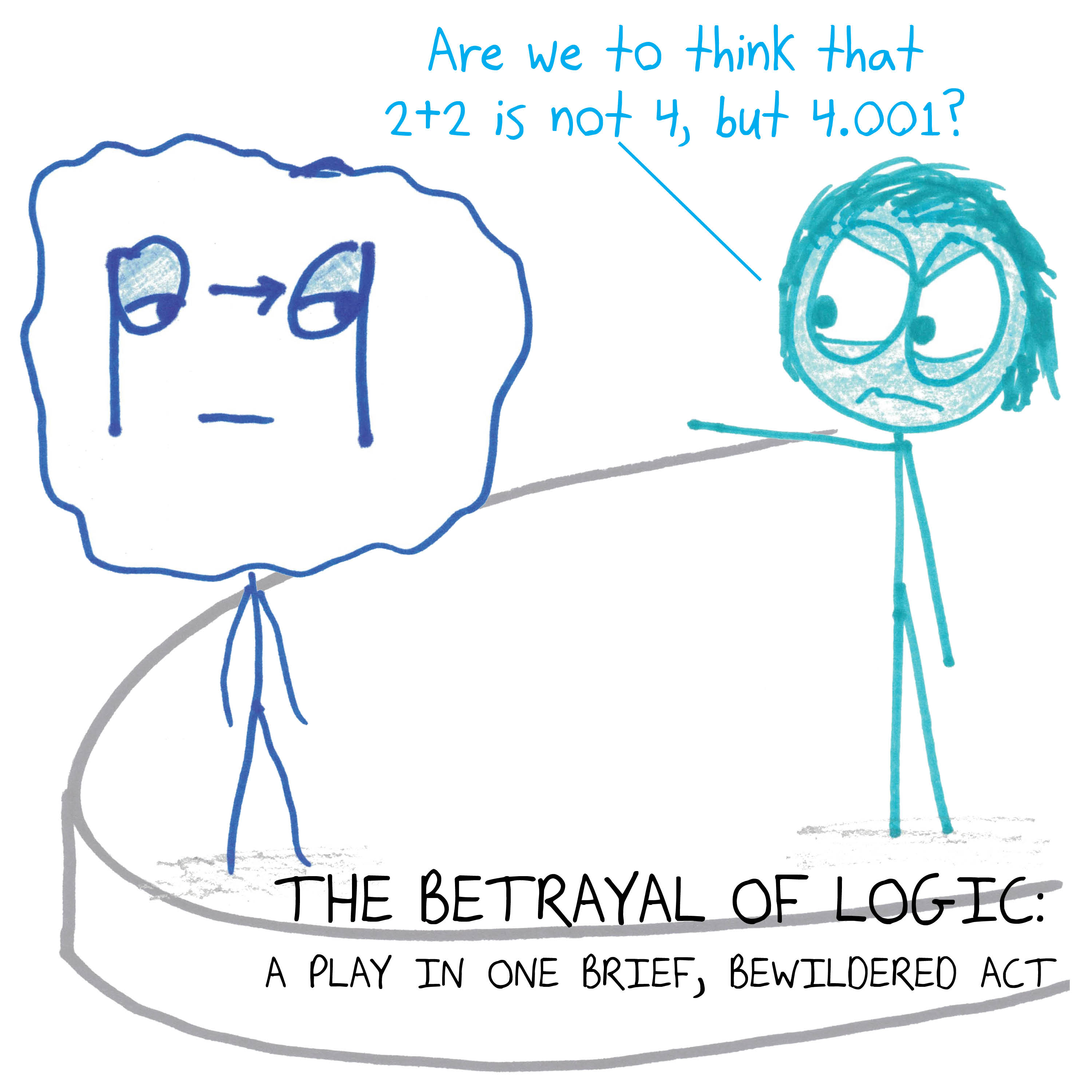 The stage is strewn with wreckage. Some great battle seems to have been fought here, and lost. Heartbroken, hair and clothes a mess, BERTRAND RUSSELL confronts his onetime love, MATHEMATICAL LOGIC.