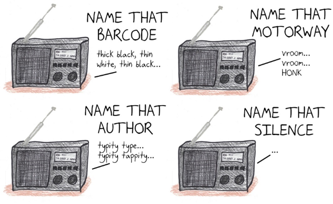 The BBC radio show “I’m Sorry I Haven’t a Clue,” a long-running parody of panel quiz shows, has some fabulous Name That Tune variants built around meaningless sounds.