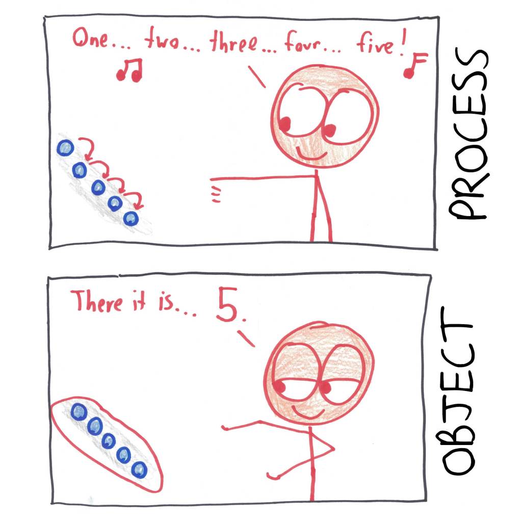 To do arithmetic — say, adding five and five — you need to take the outcome of this counting process, and begin treating it as an object in itself, a move that Sfard calls reification.