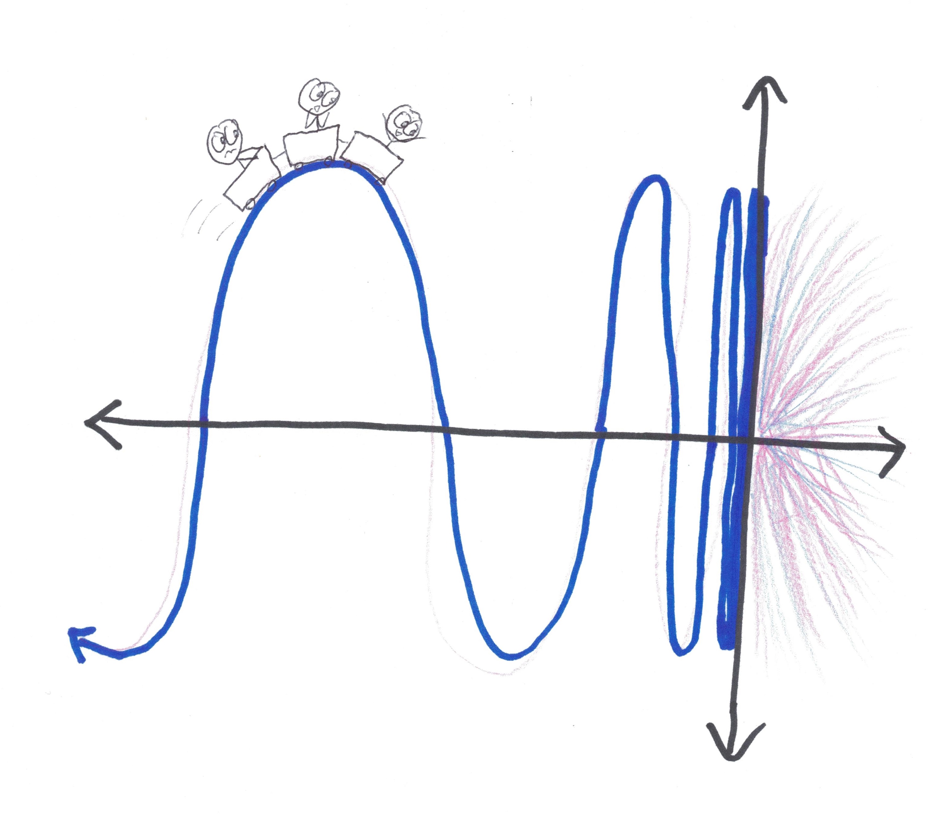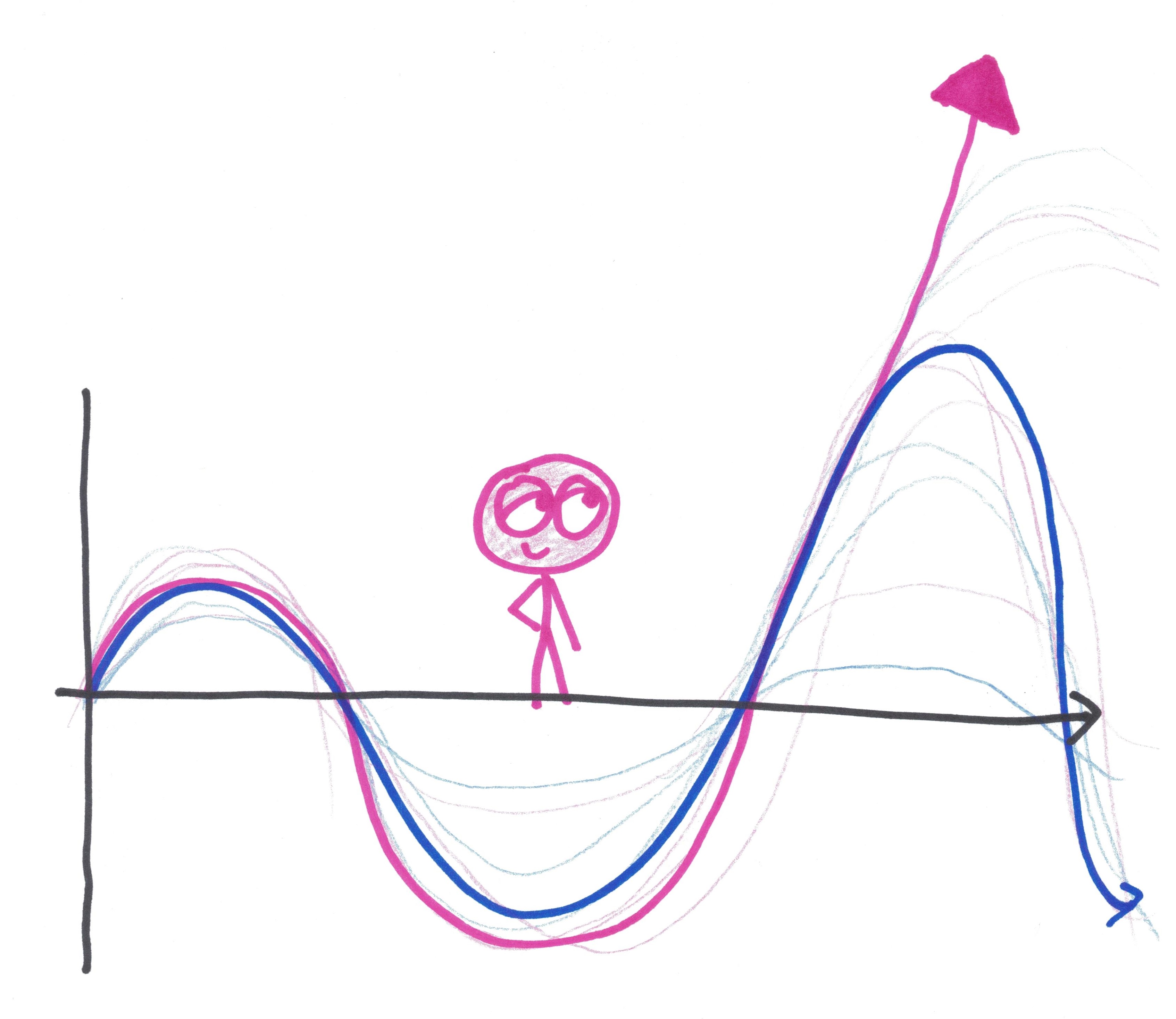 1. Another way in which the word “limit” misleads is that it implies that the limit is a place you never get to. Not always! Consider (sin x) / x as x goes to infinity. It approaches 0, but 0 isn’t a boundary; in fact, (sin x) / x equals 0 infinitely often as x gets larger and larger. To me, this function is a metaphor for the way we strive for balance in life, trying to achieve moderation but sometimes merely succeeding in alternating between one form of immoderation and its opposite. We can’t achieve perfection, but we can approach it with oscillations that decrease in magnitude over time.
