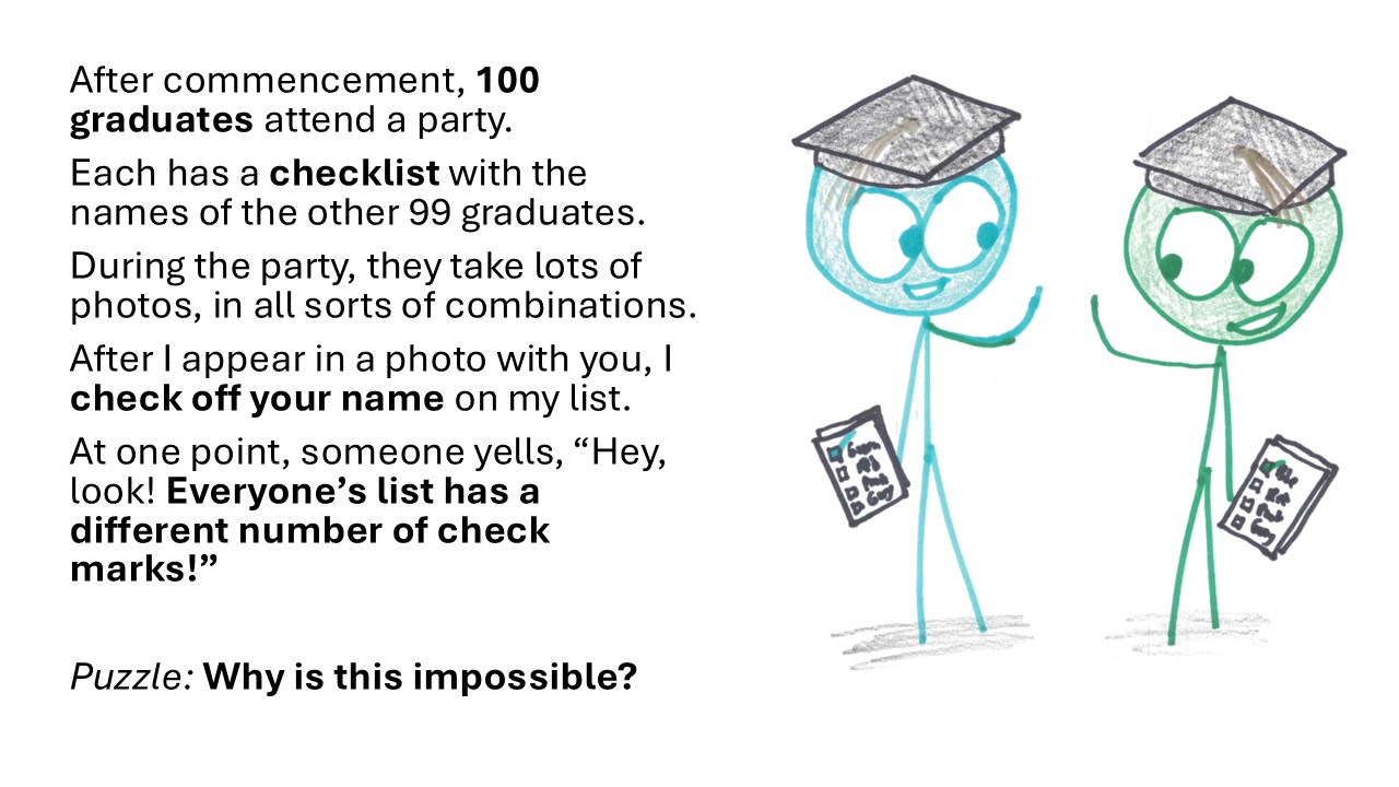 And then throw another party, identical in every way except that the guests may take surreptitious selfies with friends in the background, so that A checks B off of their list, but B is unaware of the photo and thus doesn’t check A off of their list. How do the answers now change?