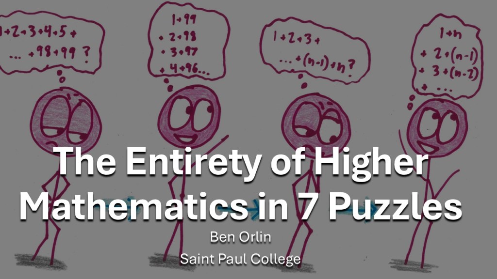 The first time giving it, on home turf at Saint Paul College, I only got through four puzzles. This means, of course, that I overdelivered, covering all of mathematics three puzzles faster than promised. You’re welcome, SPC friends.