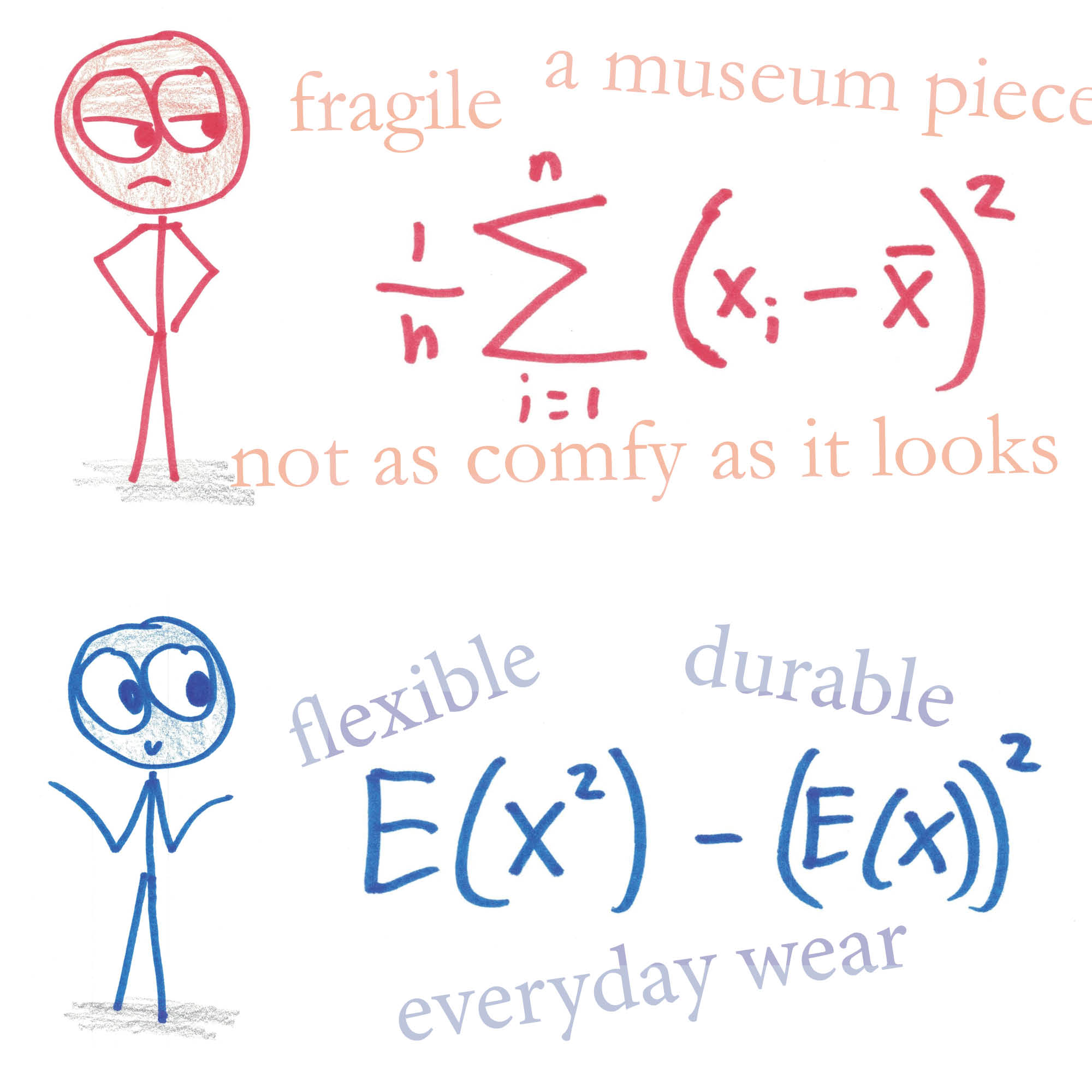 I did so because I realized that (1) my case for the orange definition of variance was going to be too similar to my case for the x –> a definition of the limit, i.e., that I like it when notation clearly conveys a sense of the concept, even at the expense of ease of calculation, and (2) this argument is actually much weaker here than in the limit definition case, because in my experience as an amateur statistician, I’m perpetually using the E(X^2) – E(X)^2 shortcut.