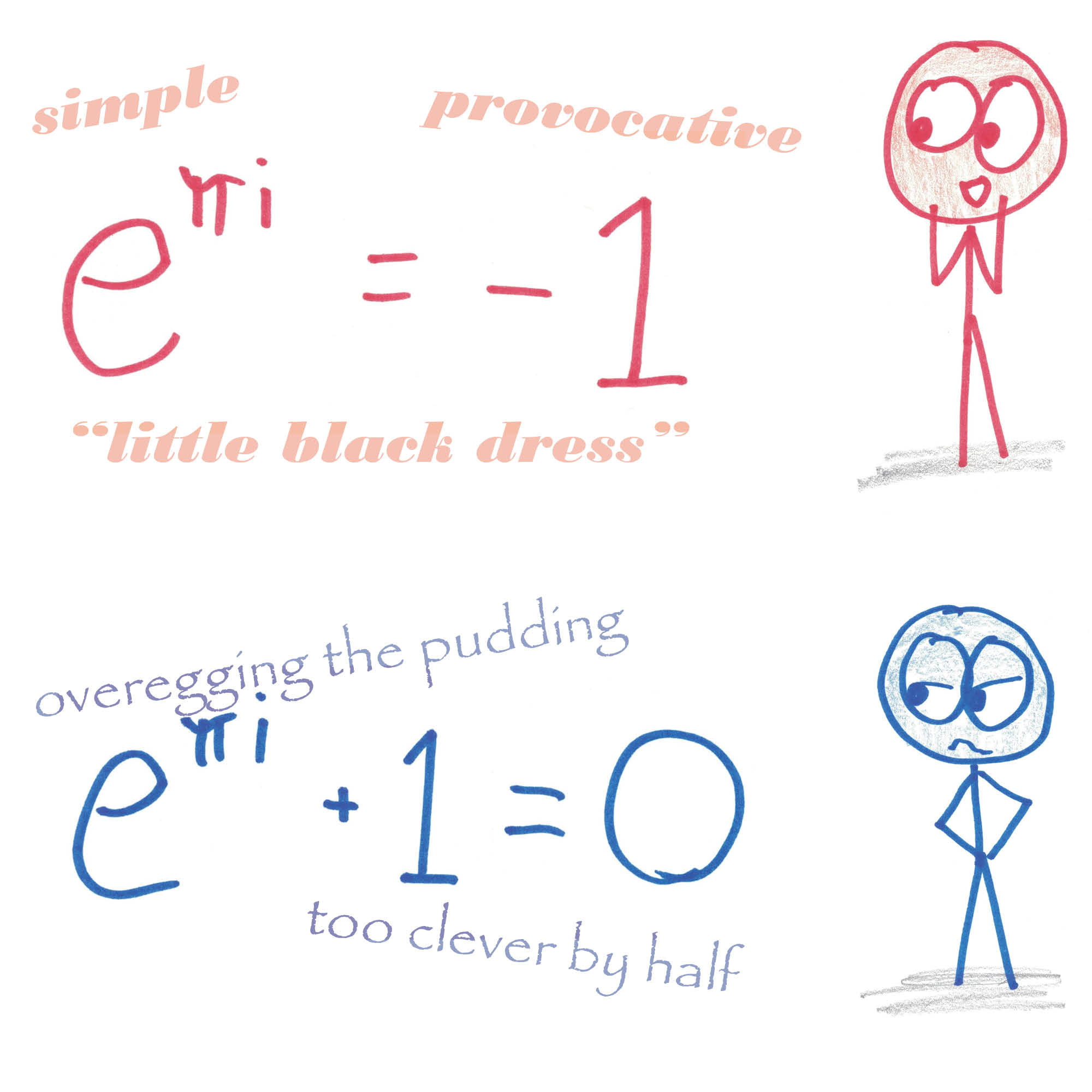 4. Also, Re: five fundamental constants of mathematics. The best wording for Euler’s identity that I’ve heard is “if you go around something, you’ll end up on the opposite side of it“. If THAT doesn’t take the bombastic rhetoric a few notches down, then I don’t know what does.