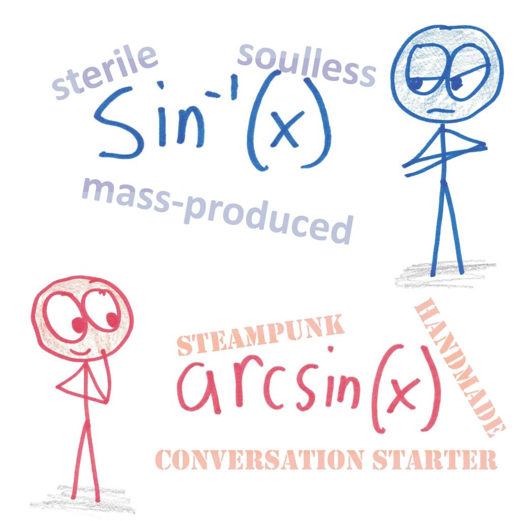 3. Here’s the problem with sin^-1. “sin^2(x)” means sin(x) * sin(x), NOT sin(sin(x)), even though “f^2(x)” means f(f(x)). That obviously means that trig functions are an exception to how exponents apply to function notation. But then “sin^-1(x)” is supposed to be an exception TO the exception?! Ridiculous. We have a NAME for that function, and it’s “arcsine”. It’s so much more clear to just use that!