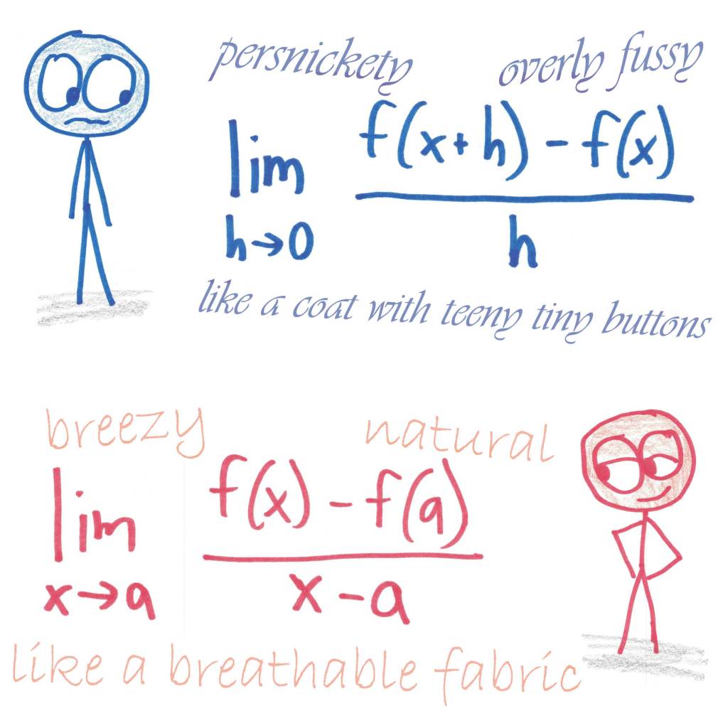 Well, then, you’re not bringing this definition to work. You’re using it to make a point: namely, that the derivative is what happens to a slope as the two points draw closer together. And that point is best made with this stylish latter version.