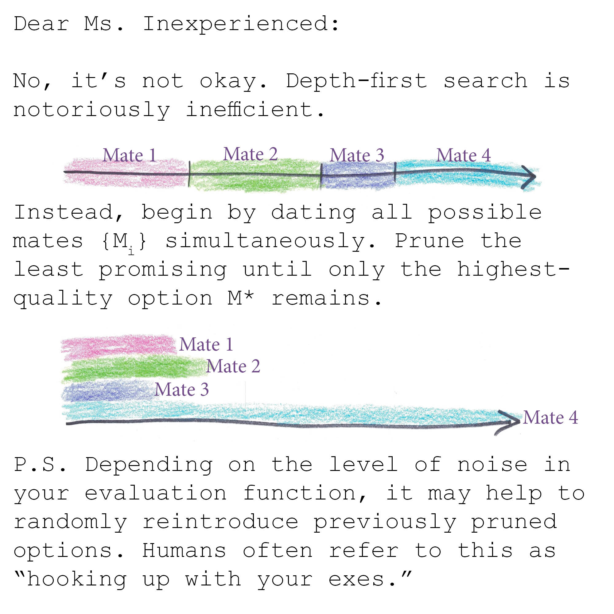 It seems strange to maximize the probability of the single best candidate, as opposed to (say) expected quality of candidate. As such, the “optimal” algorithm has the peculiar feature that, 1/e of the time (when the best candidate happens to appear during your training period), you’ll wind up failing your search and selecting whichever candidate happens by random chance to be the final one interviewed.