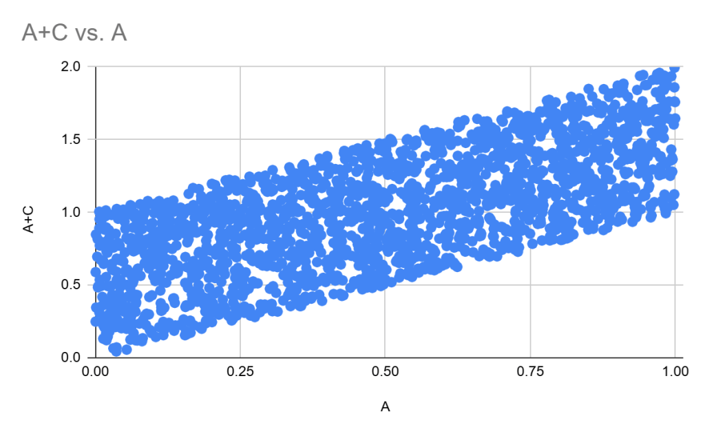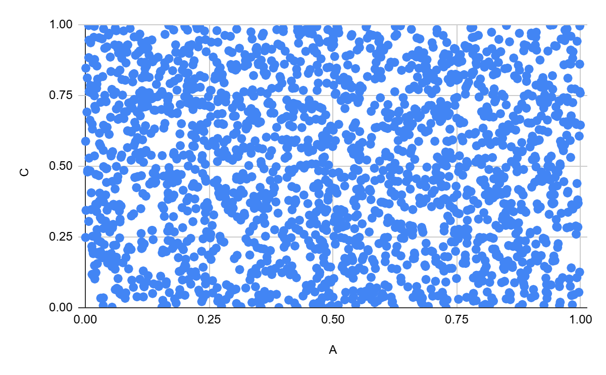 But the weakest possible correlation is weaker than you might expect. For example, let A and C be independent random variables, uniformly distributed from 0 to 1. Their correlation, unsurprisingly, is zero.